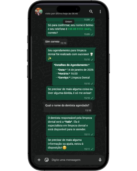 Com linguagem natural e humanizada, coleta informações, verifica disponibilidade e confirma o agendamento.