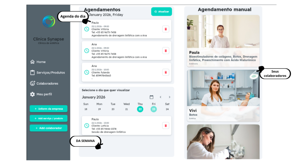 📌 Demonstração configurada como Clínica médica é apenas um exemplo. Na sua empresa, personalizará o atendimento, serviços, horários e equipe de acordo com seu negócio.